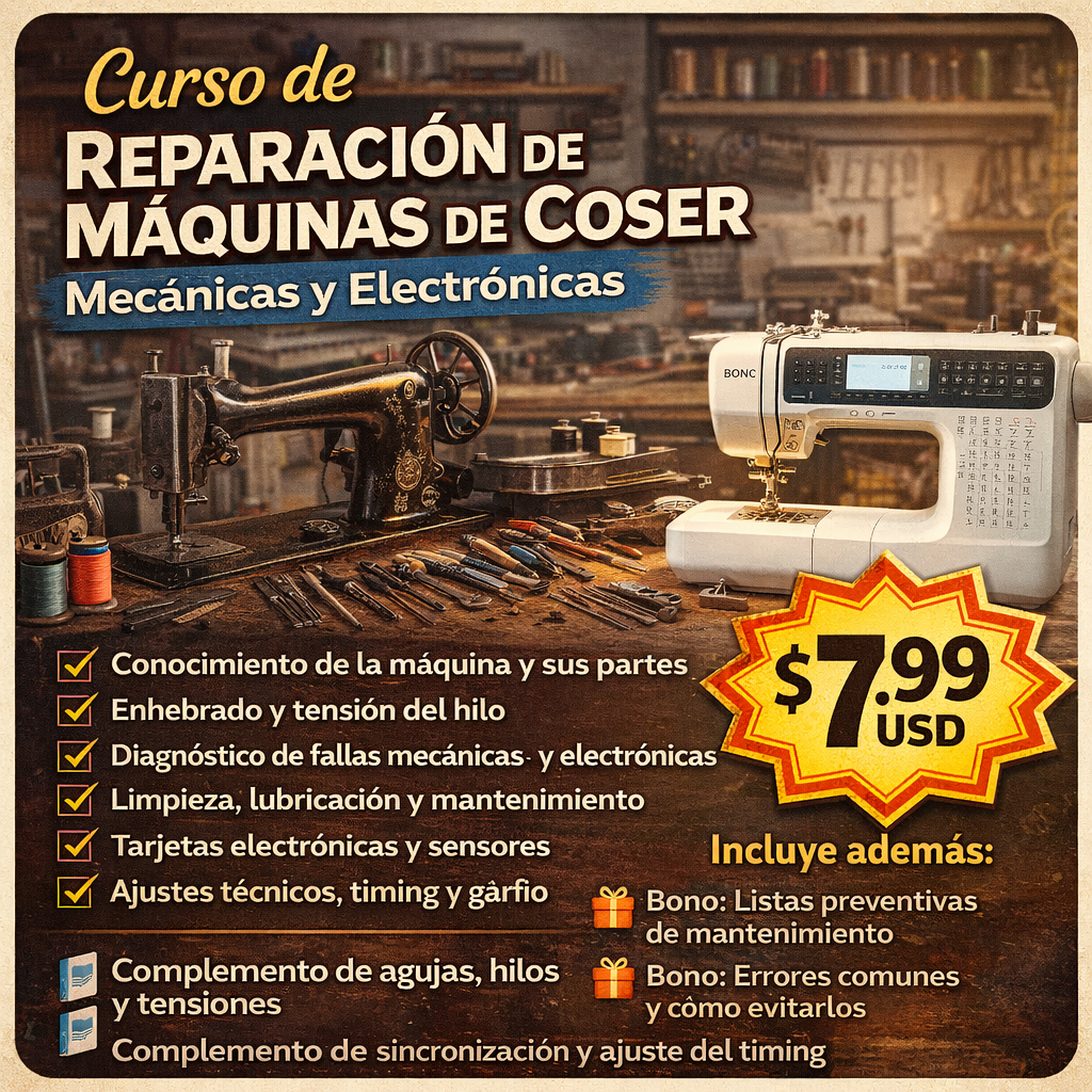"Esta es probablemente la mejor inversión que puedes hacer hoy si tienes una máquina de coser en casa o quieres empezar a reparar. Por $7.99 recibes formación técnica que normalmente costaría mucho más."